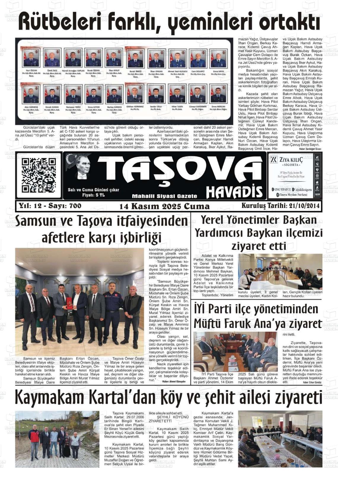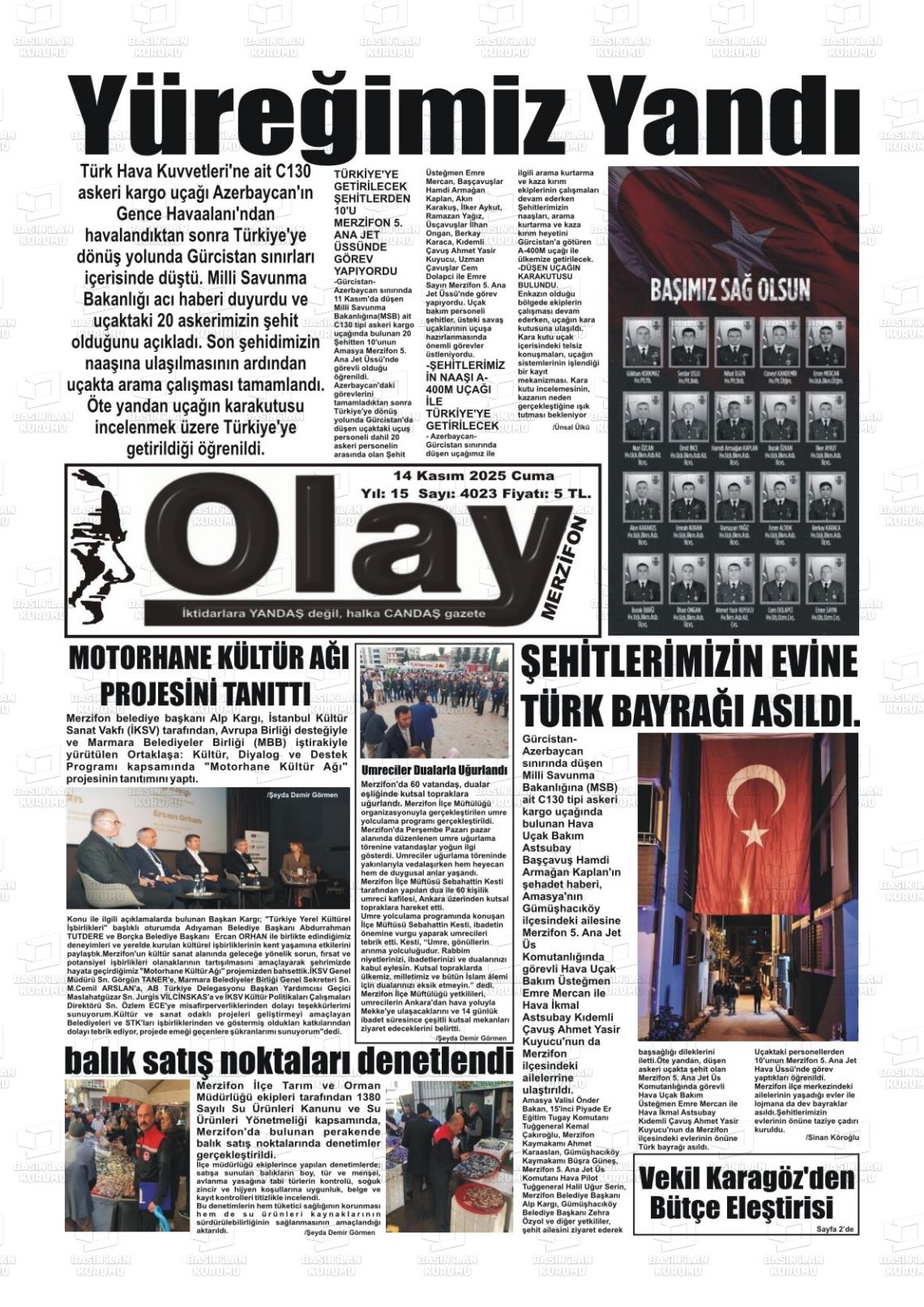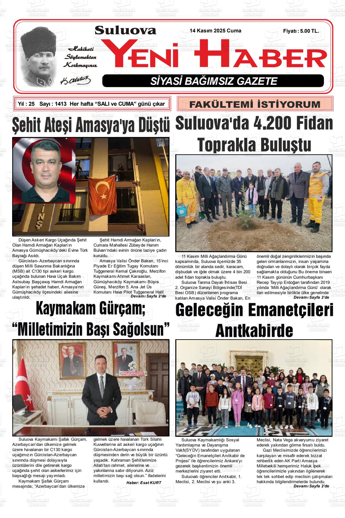 Amasya Yerel Gazeteleri 14 Kasım 2025, Cuma Günü Manşeti